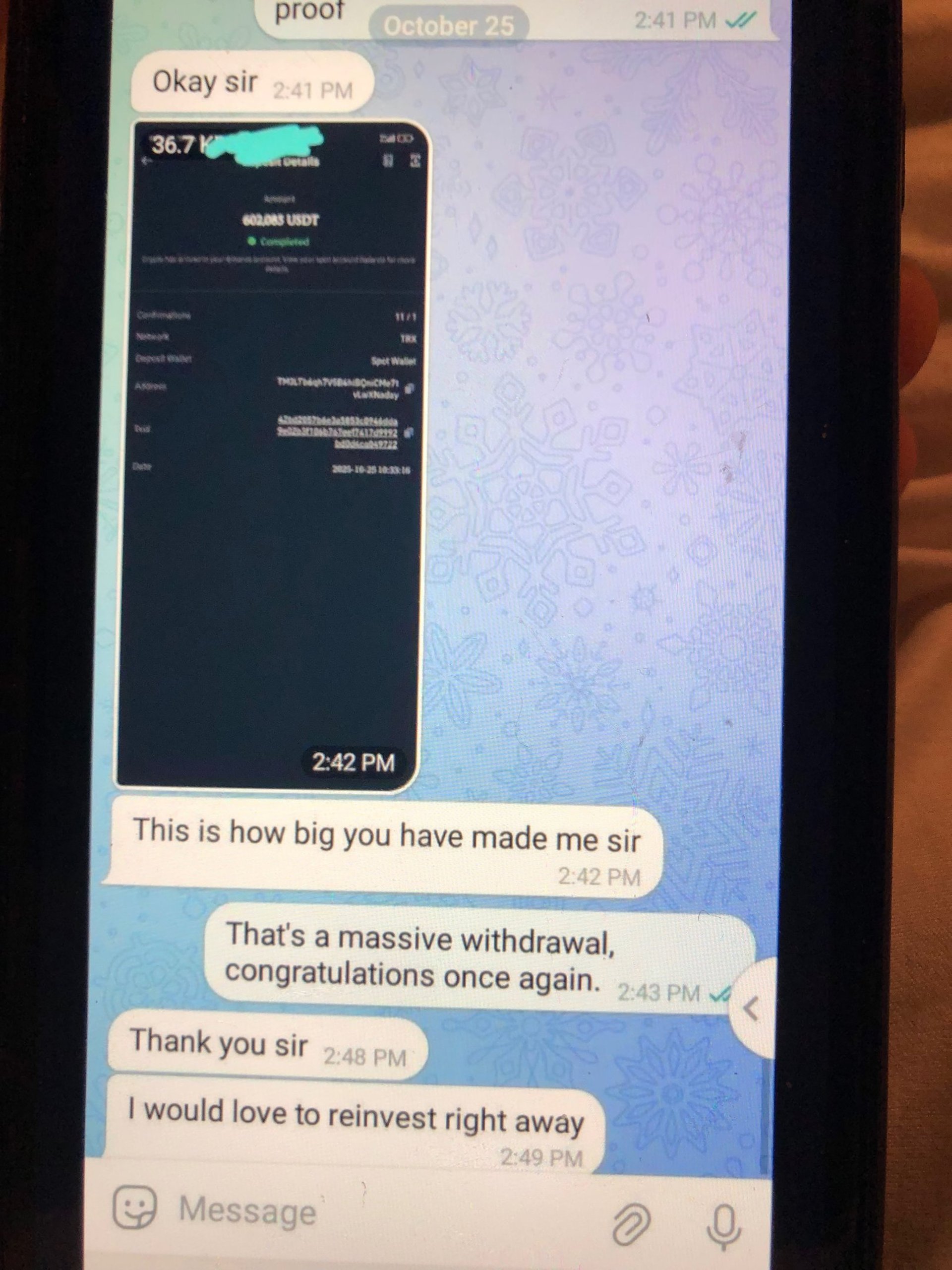 The best part for everyone. Once profit is ready, it will be sent to the provided address in the information you filled in a form while investing. Make sure to send screenshots of your profits, so we can spread and share this revenue
